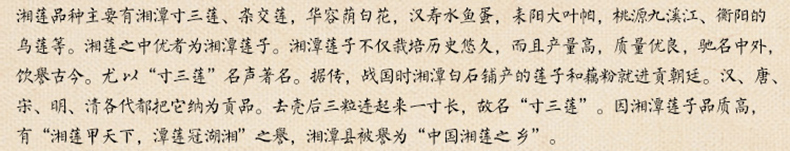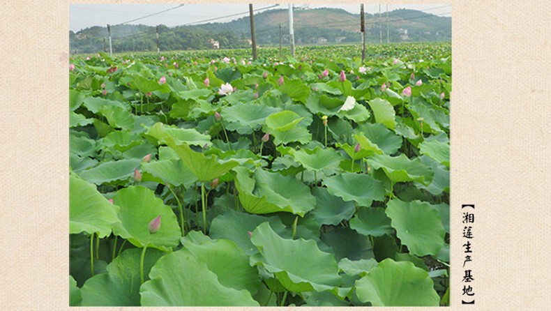 產(chǎn)品描述:湖南蓮子即“湘蓮”,三粒連起來一寸長。湖南湘蓮粒大飽滿,潔白圓潤,質(zhì)地細(xì)膩,清香鮮甜。在歷史上被稱為“貢蓮”,至今已有二三千年的種植歷史。