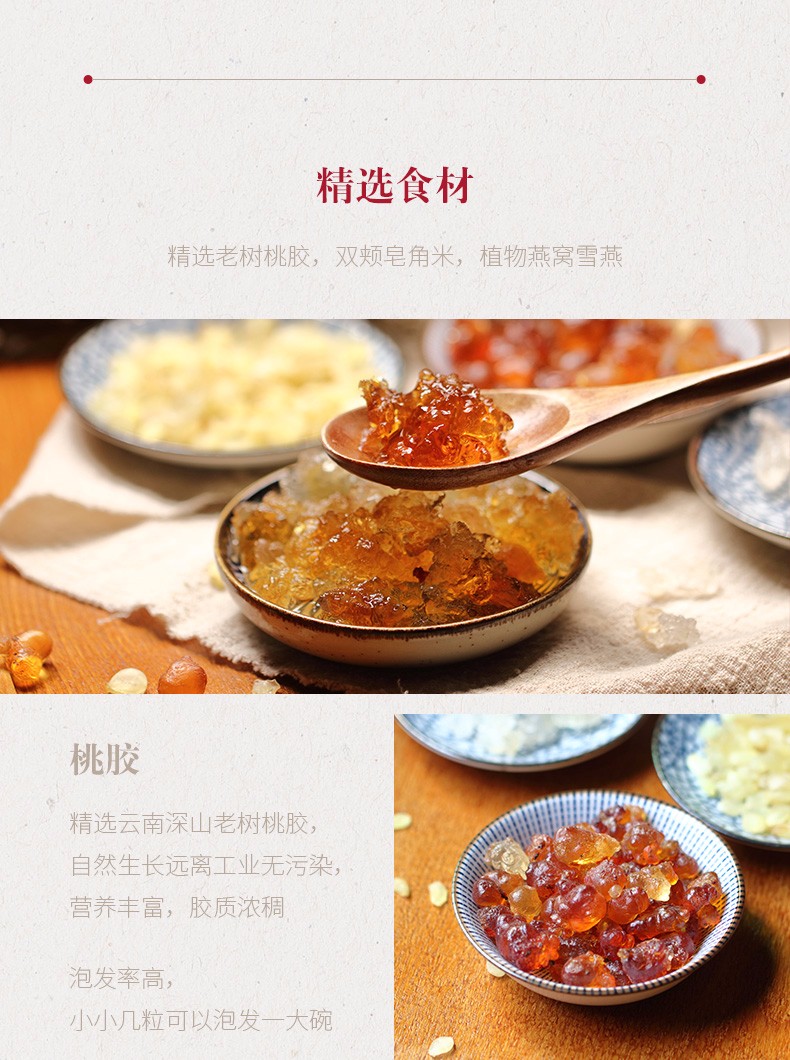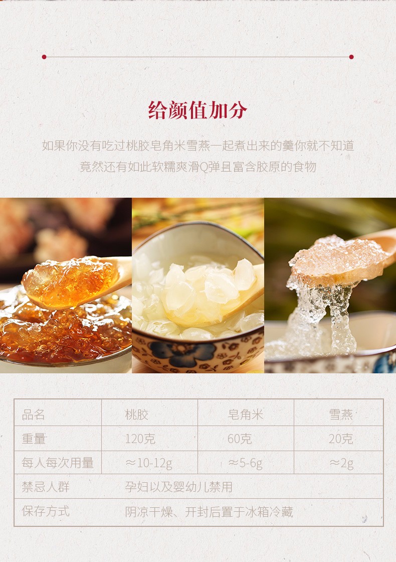 凈含量:桃膠120g+皂角米60g+雪燕20g