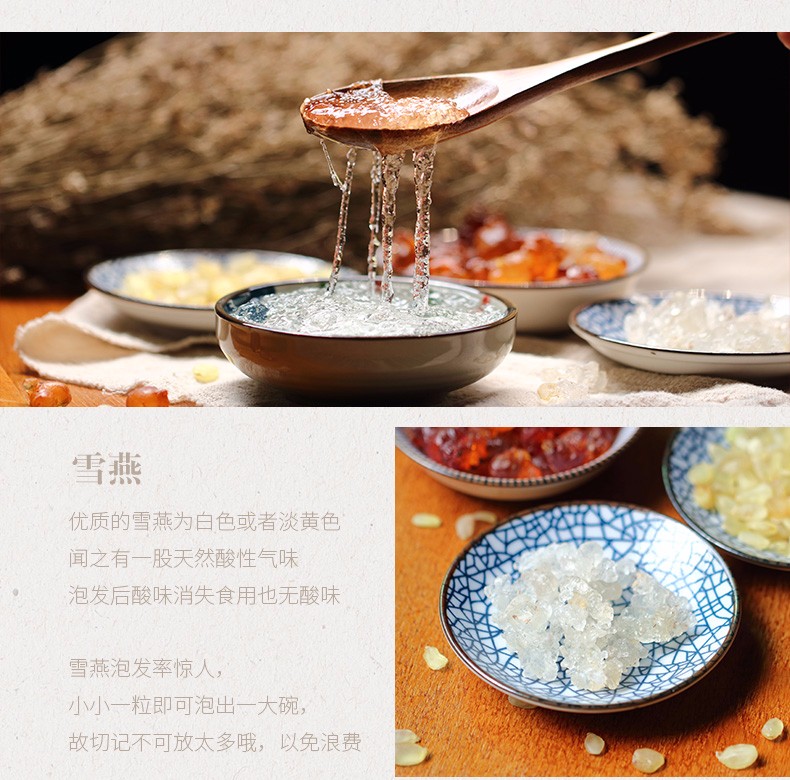 產品描述:精選云南深山老樹桃膠,營養(yǎng)豐富,膠質濃稠。雙頰皂角米,營養(yǎng)高軟糯有彈性。優(yōu)質的雪燕為白色或者淡黃色,聞之有一股天然酸性氣味,泡發(fā)后酸味消失食用也無酸味。桃膠皂角米雪燕組合,科學配比,營養(yǎng)更均衡。
