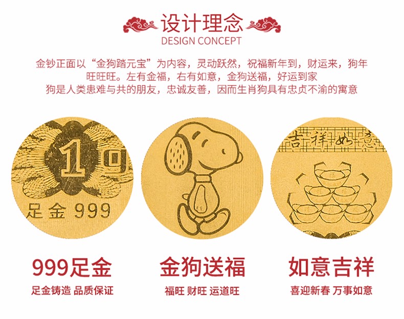 產(chǎn)品描述:采用平雕工藝,紋理細膩,輕薄精巧,足金鑄造,品質(zhì)保證,金狗送福,福旺,財旺,運道旺。