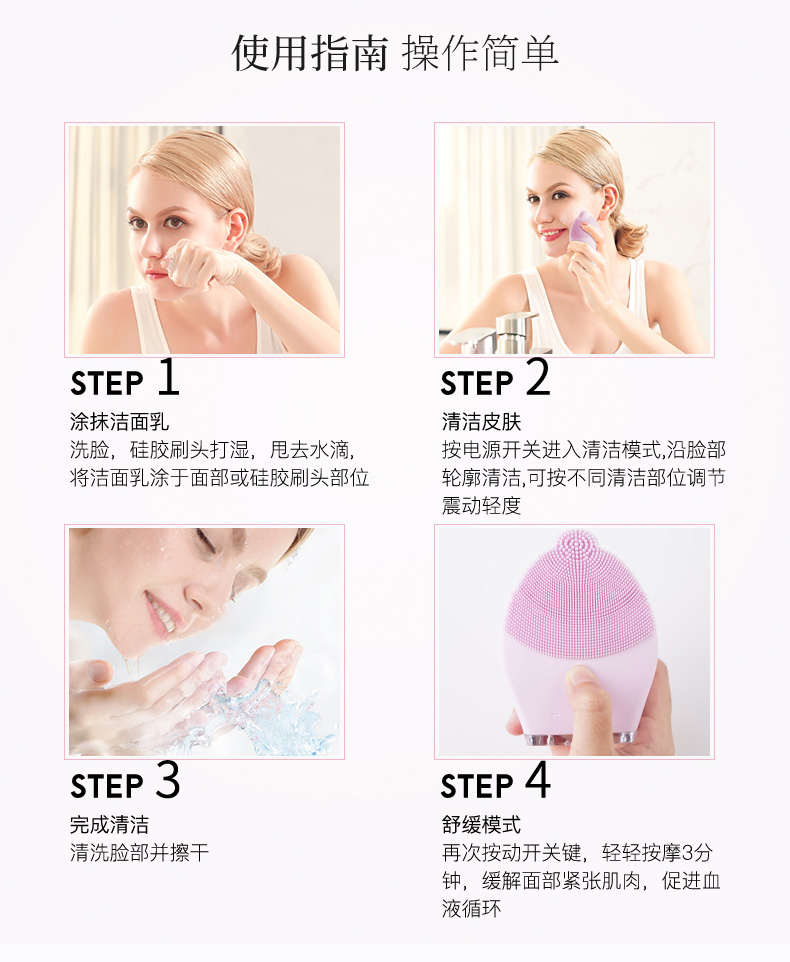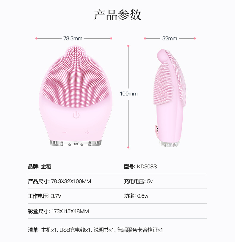 產品描述:通過雙重振動潔面科技,透過皮膚表層傳遞至深層,清理毛孔雜質,造型精巧Q萌,輕松應對您日常肌膚清潔需求,精選食品級硅膠,可全身水洗不易藏細菌。