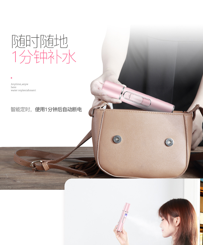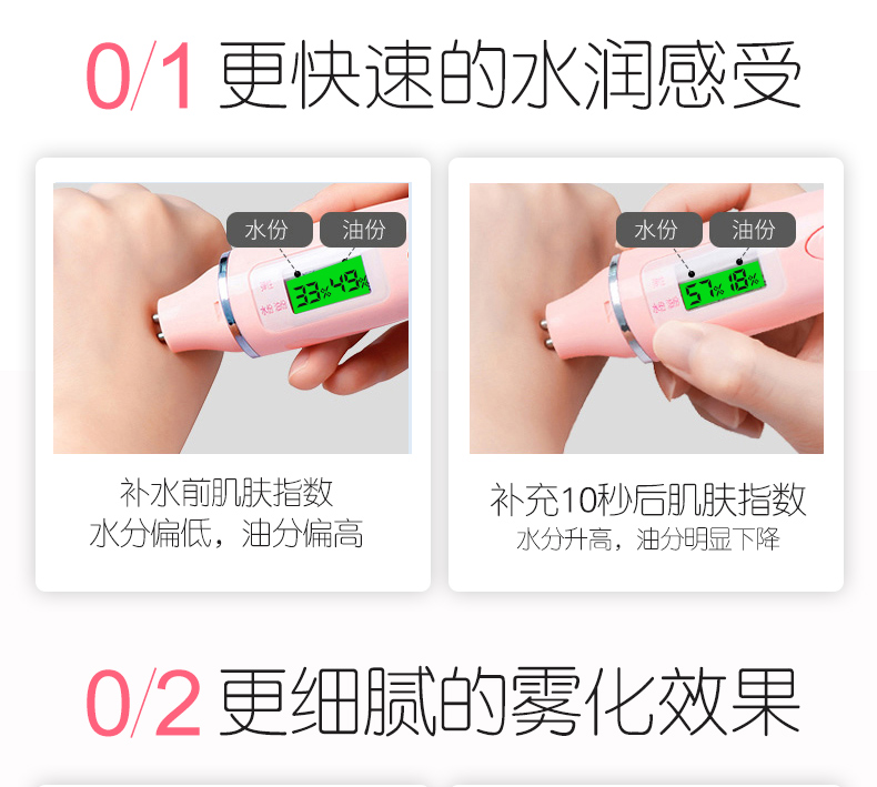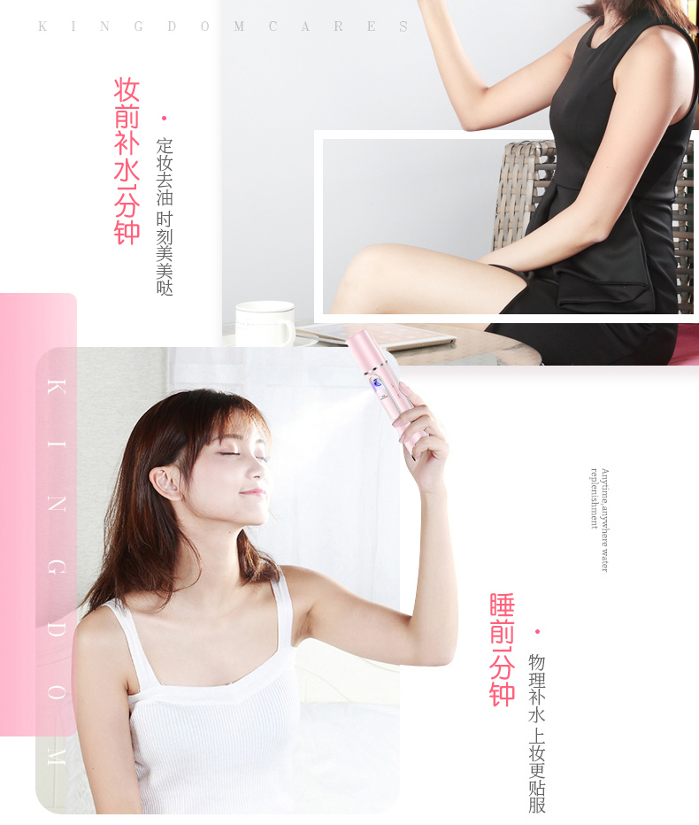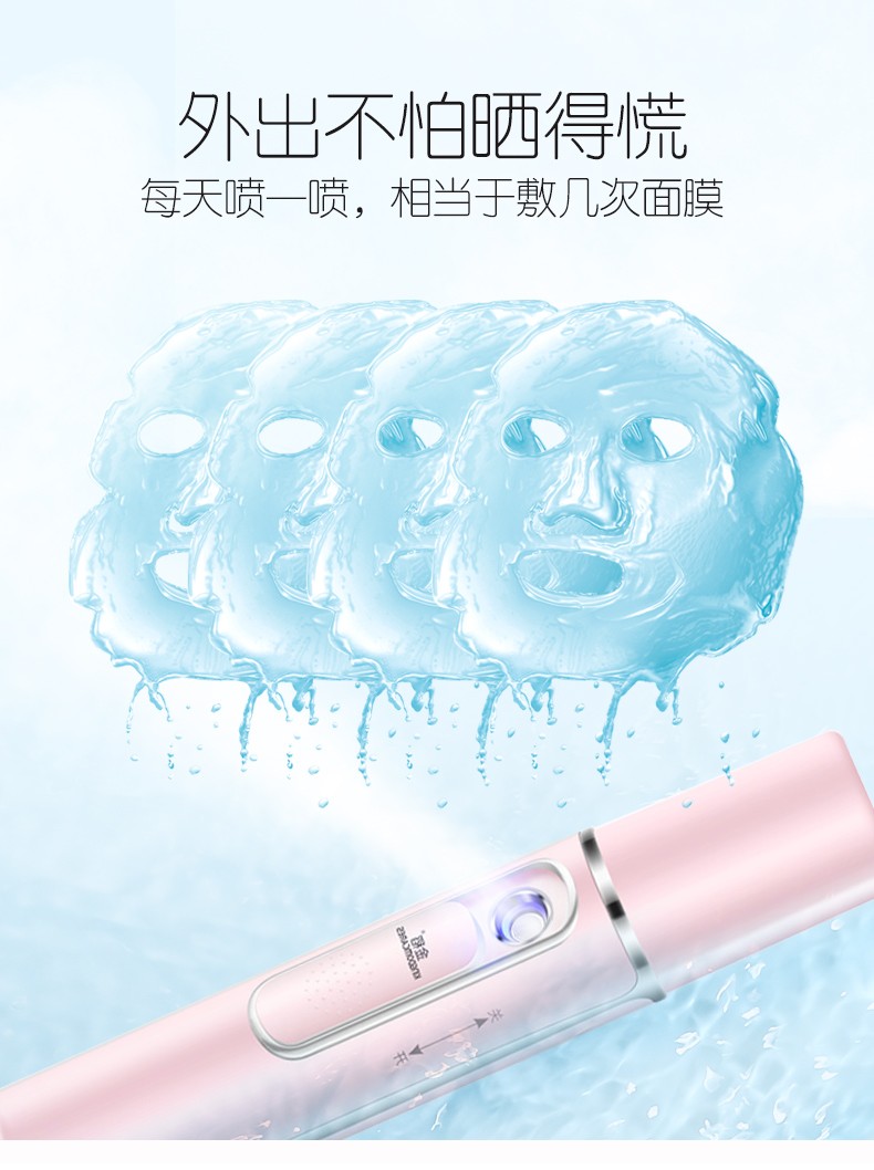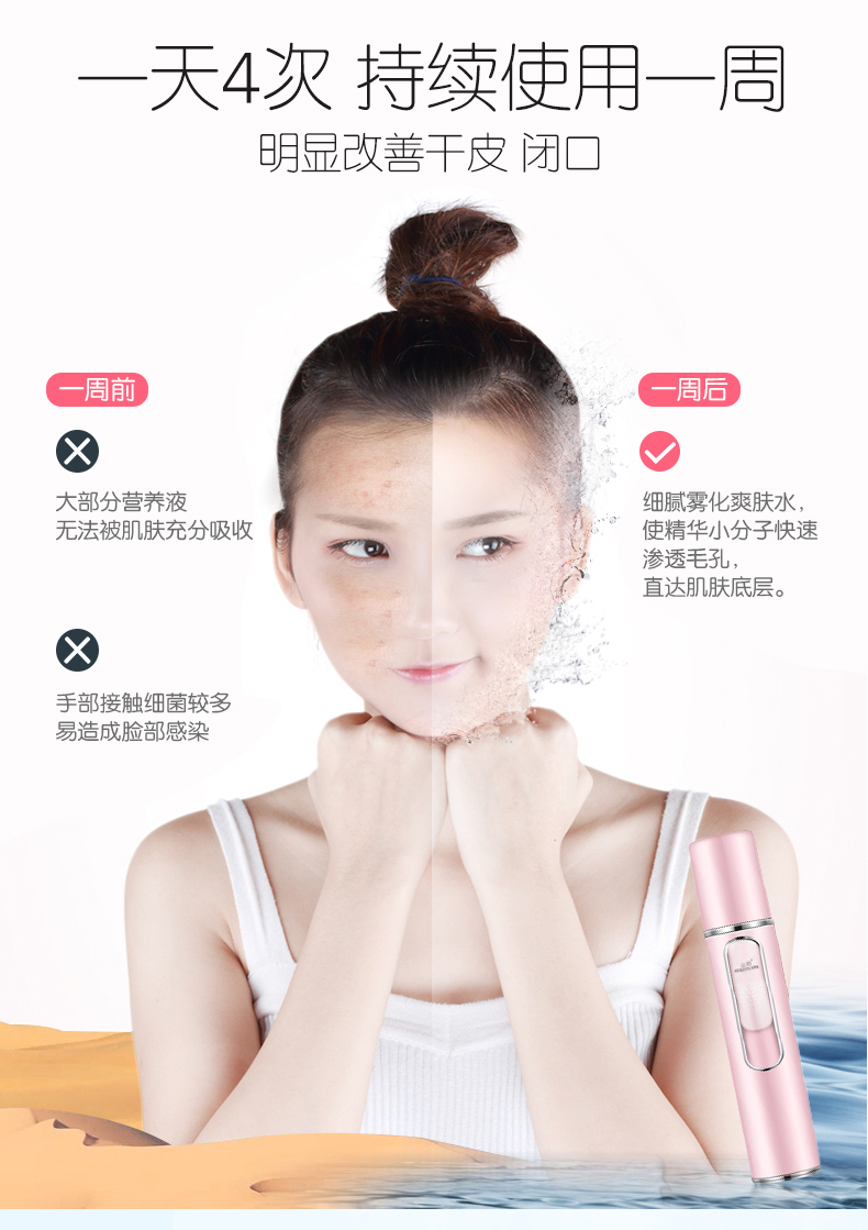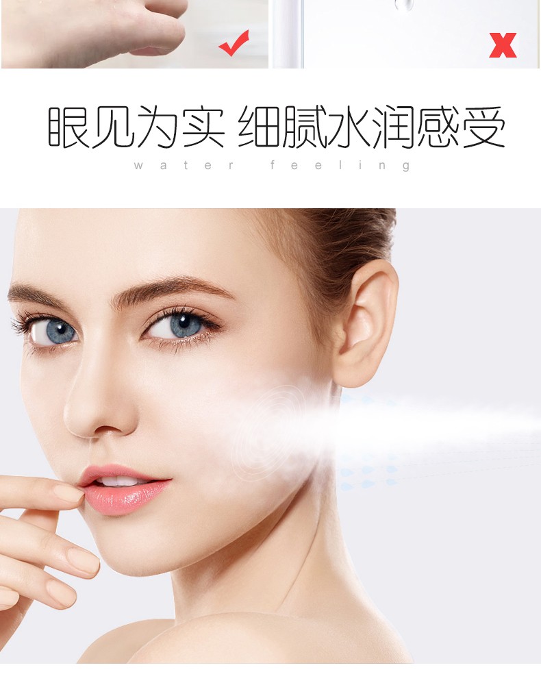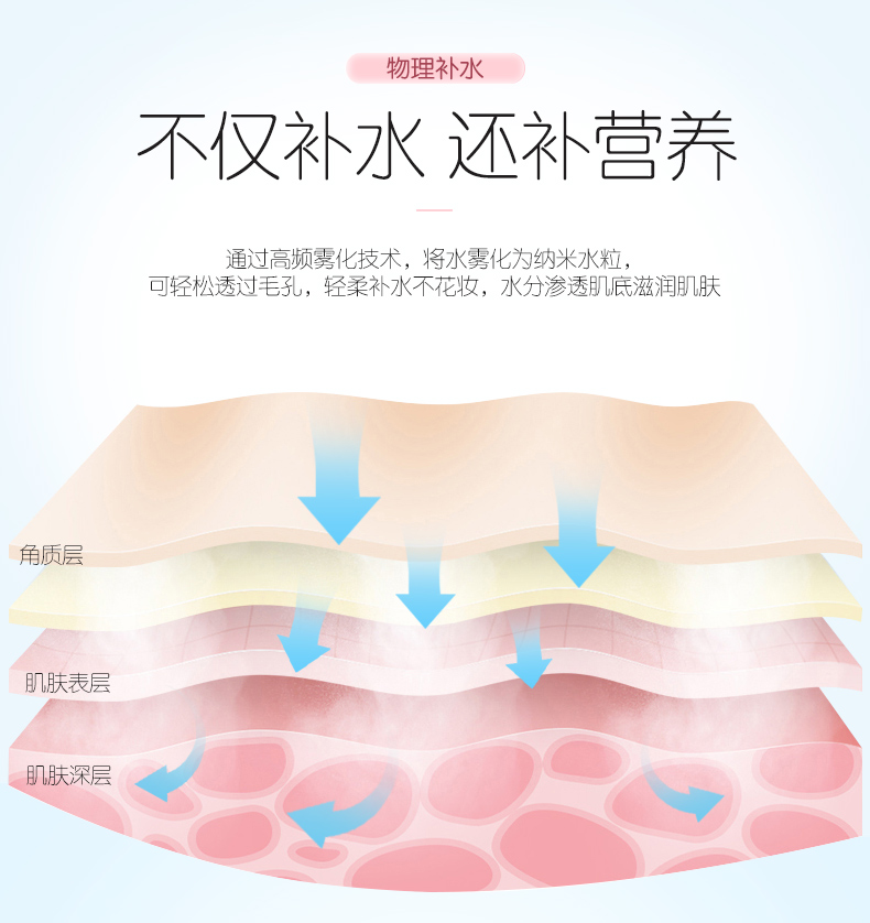 產(chǎn)品描述:通過高頻霧化技術(shù),將水霧化為納米水粒,可輕松透過毛孔,輕柔補水不花妝,水分滲透肌底滋潤肌膚,采用空氣負壓、均勻霧化技術(shù),形成納米噴霧13度夾角,覆蓋臉部直達肌膚底層,營養(yǎng)快吸收