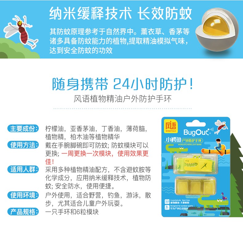風(fēng)語 大眼睛戶外驅(qū)蚊防護手環(huán)*1+防護手環(huán)方形替換模塊 (9片裝)*2共24片模塊