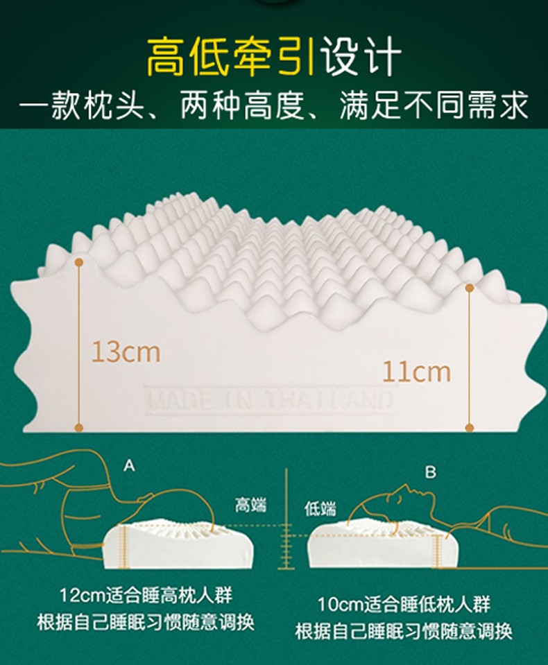 泰國(guó)乳膠枕頭 枕芯 原裝進(jìn)口天然成人顆粒按摩頸椎橡膠記憶枕 高低平滑枕 60*40*10/12